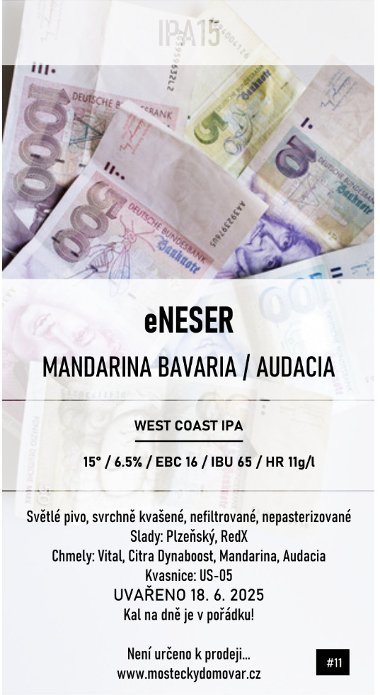 Lehká změna ve sladech - plzeň a redX, cílem byla minimalizace karamelu, nižší tělo. Zdá se, že se povedlo. US-05 příjemně překvapily a aroma je po 3 týdnech od uvaření obilné, příjemně citrusové, mandarinka je jasně rozpoznatelná.
